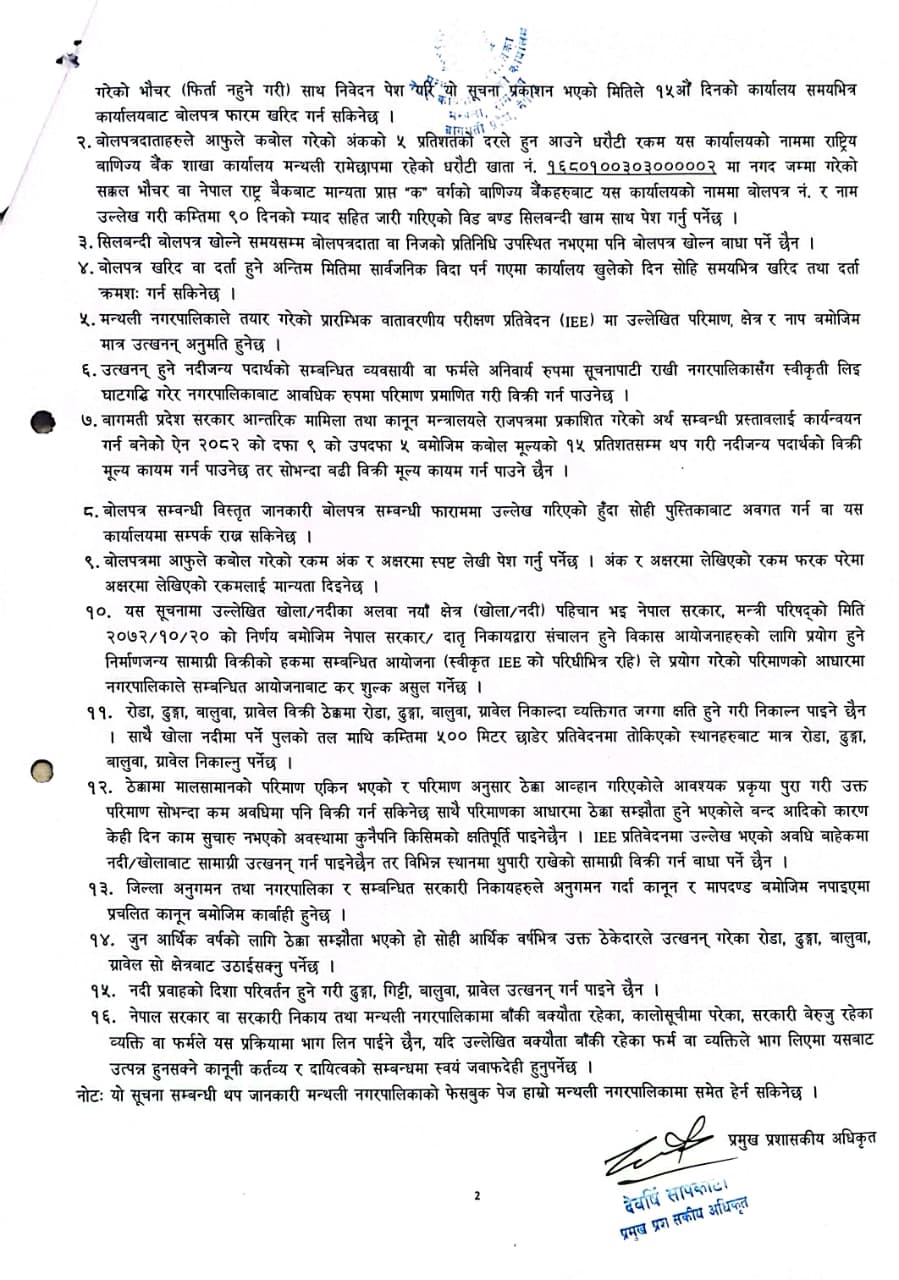 नदिजन्य कच्चा पदार्थ उत्खनन् संकलन र विक्रिका लागि बोलपत्र आव्हान सम्बन्धी पुनः सूचना ।